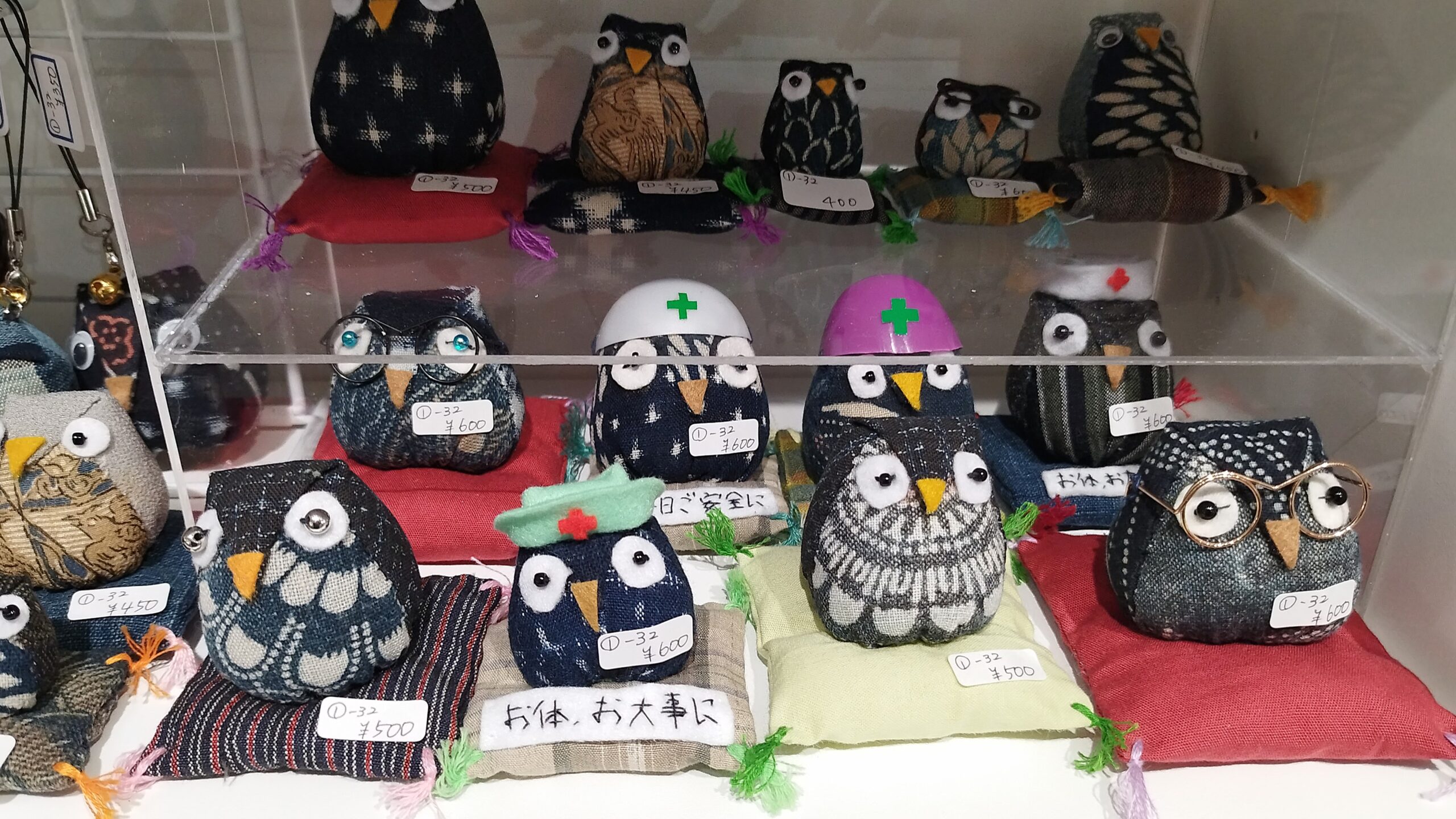 大小さまざまなフクロウが皆様のお越しをお待ちしています。