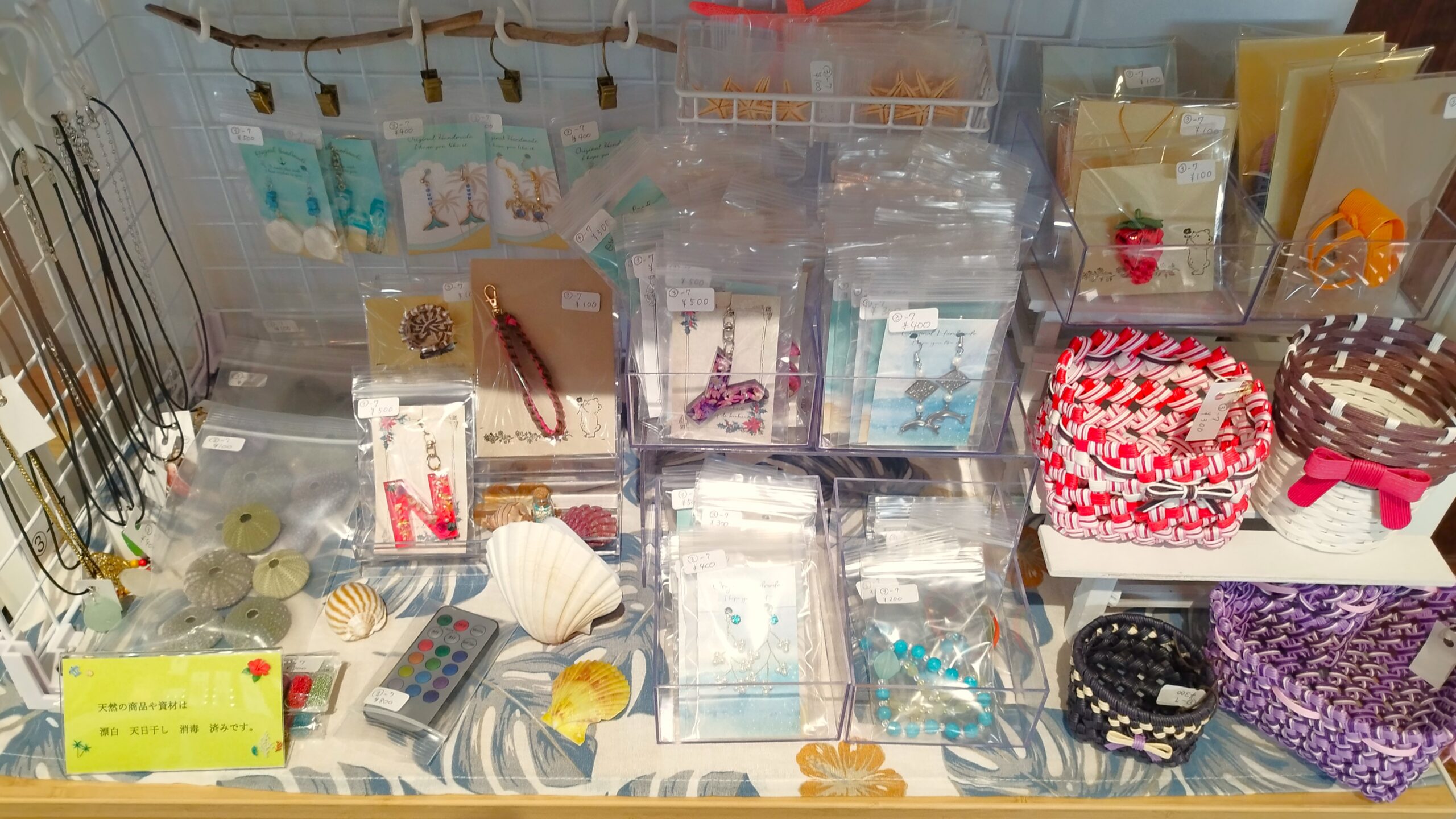 海岸に打ち上げられるシーグラスや珍しい貝殻などを素材として販売しています。