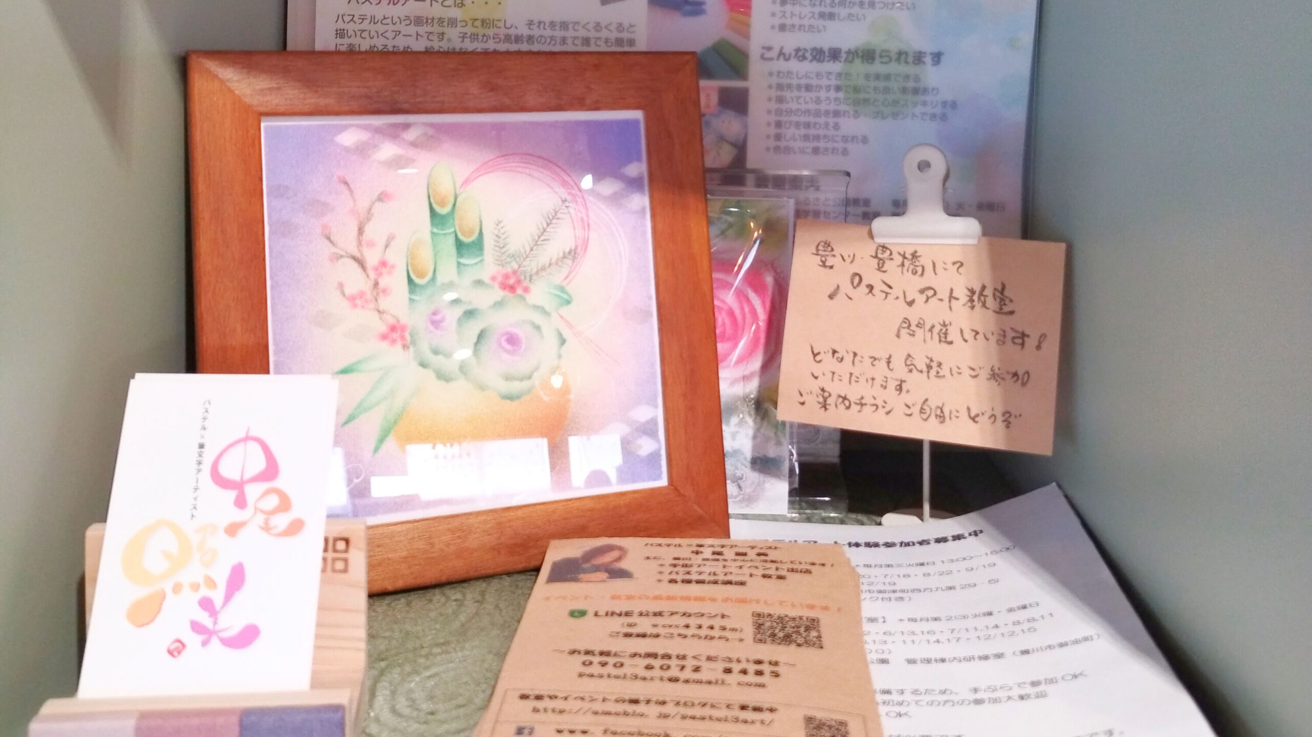 パステルと筆文字の先生です。豊川・豊橋を中心にいろいろな場所での教室を開催。イベントにも積極的に参加されてます。イベントでは『手足がよごれない!パステル手形・足形アート』が大人気です。